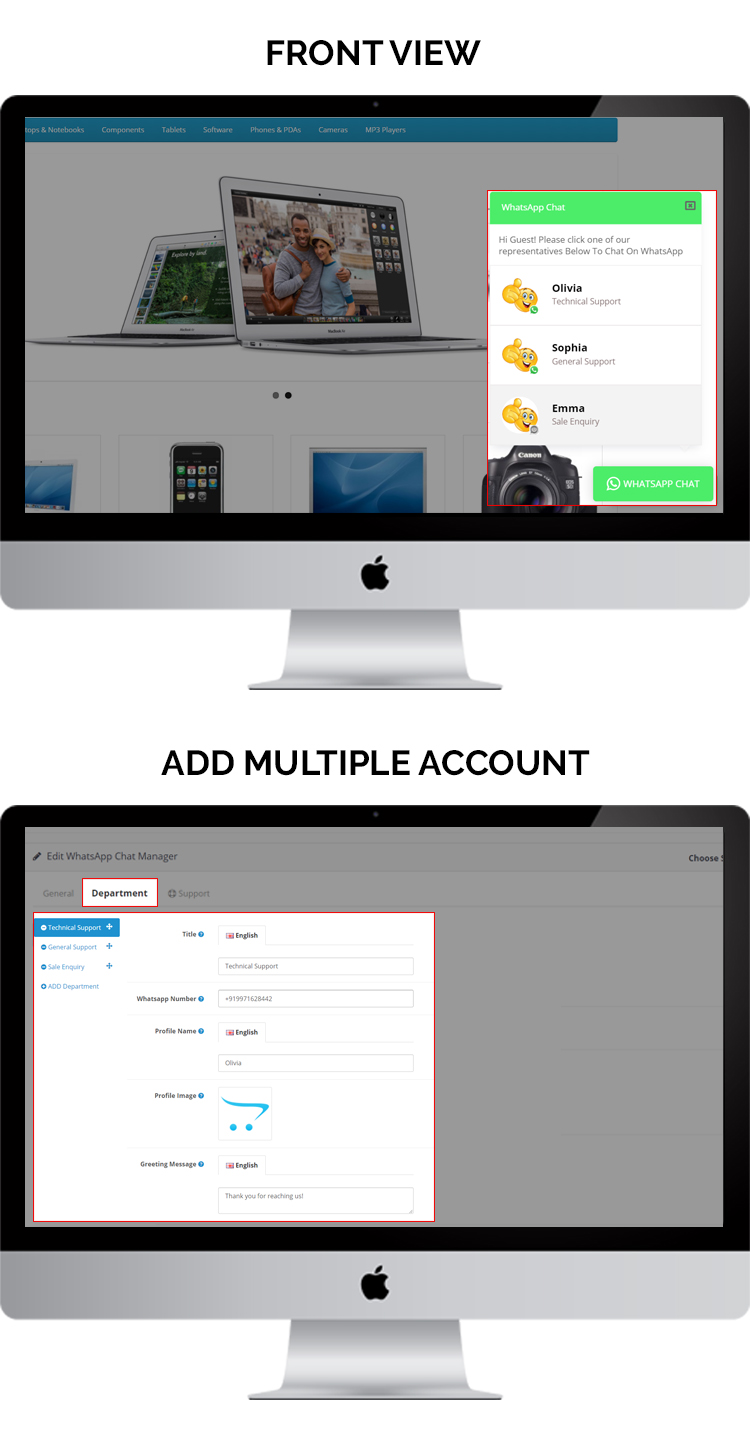 With the help of this extension, you can use WhatsApp chat .customer can click and start chatting with you,you don't have to sit around any software or system to access this, you can chat with your customers from anywhere through your Mobile or any device.this extension will give you the flexibility to use multiple WhatsApp number or accounts.you can create as many account or department using this extension e.g Technical support, Sales enquiry etc